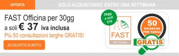 Attiva la promozione per usare FAST Officina 30 giorni a soli 37 euro iva inclusa, avrai in REGALO 50 consultazioni per utilizzare la ricerca per targa.